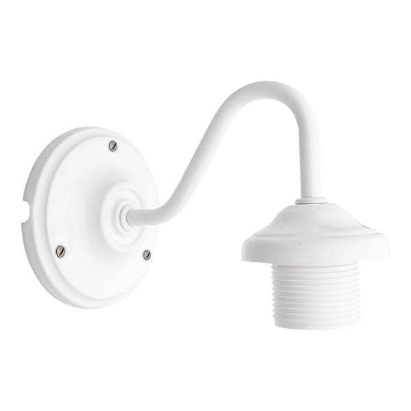 Wandstrahler mit gebogenem Arm aus Metall, der aus einer Basis aus emailliertem Porzellan, Farbe weiß, herauskommt. Lampenfassung für Glühbirne mit Standard Schraubgewinde (E-27) mit Befestigungsringen für alle Arten von Schirmen, Glasschirme, Platten, etc. Sie kann auch mit dekorative Glühbirnen Typ Vintage oder LED Globes kombiniert werden.