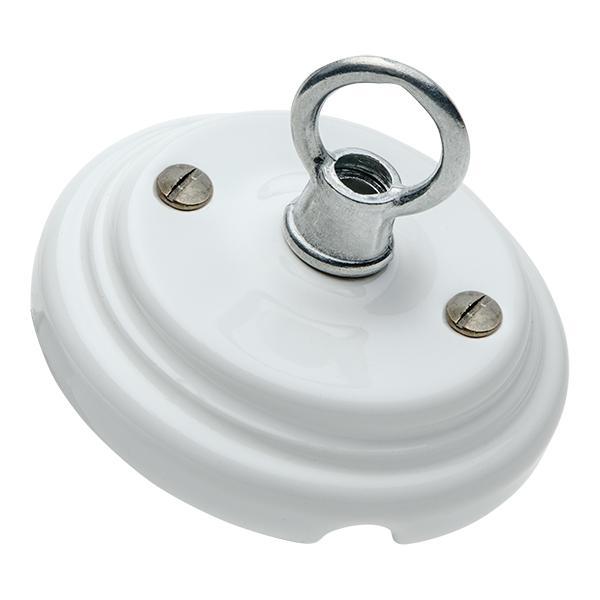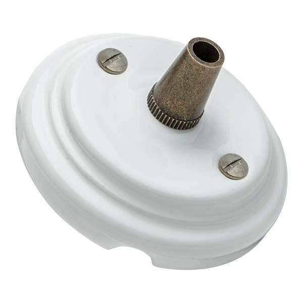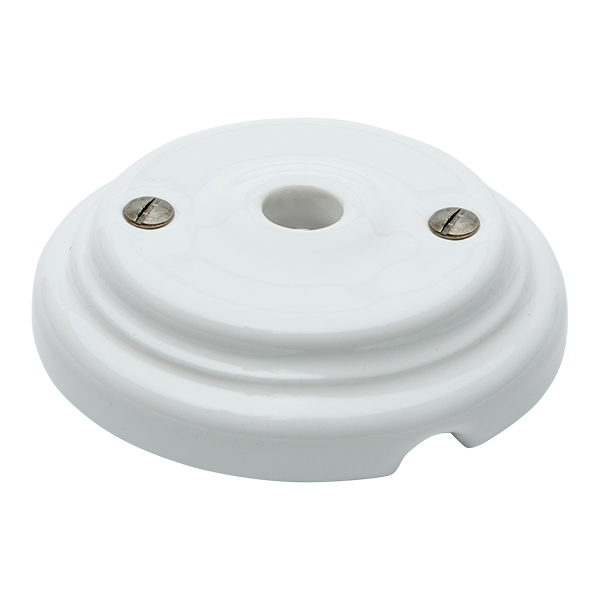 Porzellanbaldachin mit feiner Oberfläche, von klaren und modernen Linien. Hergestellt aus Porzellan weißer Farbe. Durch seine reduzierte Größe eignet er sich für verschiedene Verwendungen, Deckenleuchten, Kabelausgang an Wand oder Decke, sichtbare Kabelverteilung, etc.