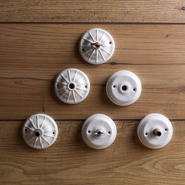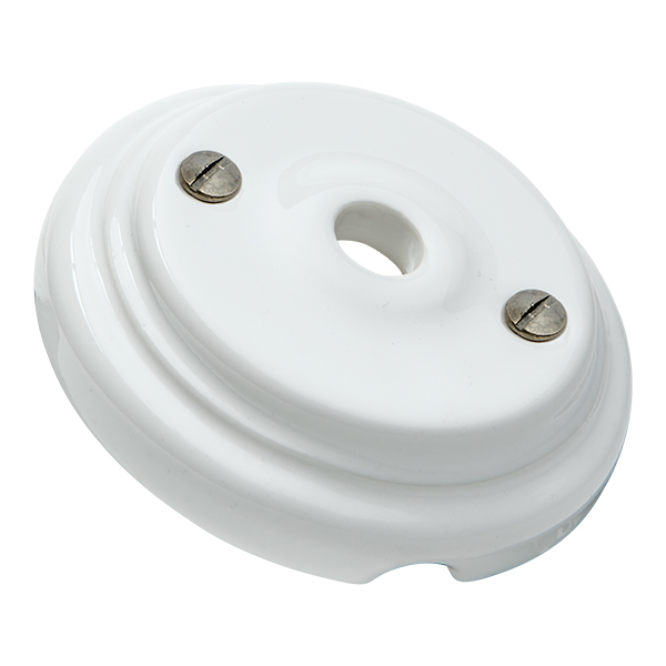 Porzellanbaldachin mit feiner Oberfläche, von klaren und modernen Linien. Hergestellt aus Porzellan weißer Farbe. Durch seine reduzierte Größe eignet er sich für verschiedene Verwendungen, Deckenleuchten, Kabelausgang an Wand oder Decke, sichtbare Kabelverteilung, etc.
