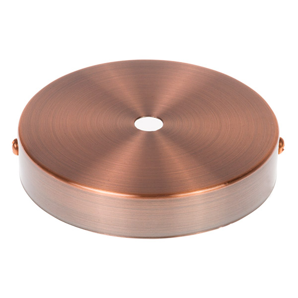 Metallbaldachin flach Oberfläche Kupfer. Vintageausgabe. Teil zur Deckenmontage und zum Verdecken der Lampenverbindung. Enthält Kit für Montage. Abmessungen: Durchmesser=99mm. Höhe=24mm. Loch für Kabel:=10mm. Kabelverschraubung und Schrauben inbegriffen.