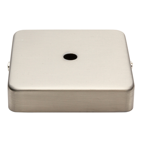 Metallbaldachin flach Oberfläche Stahl natur. Seine quadratische Form macht ihn etwas speziell, indem er sich von den klassischen runden Baldachinn unterscheidet. Teil zur Deckenmontage zum Verdecken der Lampenverbindung. Enthält Kit für Montage.