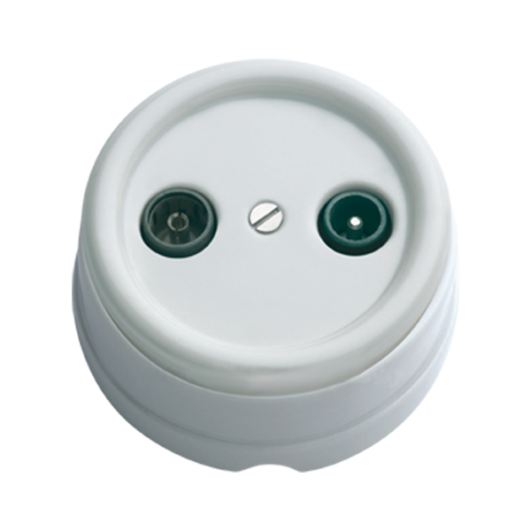 Schalter mit Fernsehdose hergestellt aus Porzellan weißer Farbe für Aufputzmontage. Lässt sich perfekt mit unseren Einzelschaltern und -steckern aus Porzellan kombinieren. Ihre Vorrichtung dient für Standard-Antennenstecker.