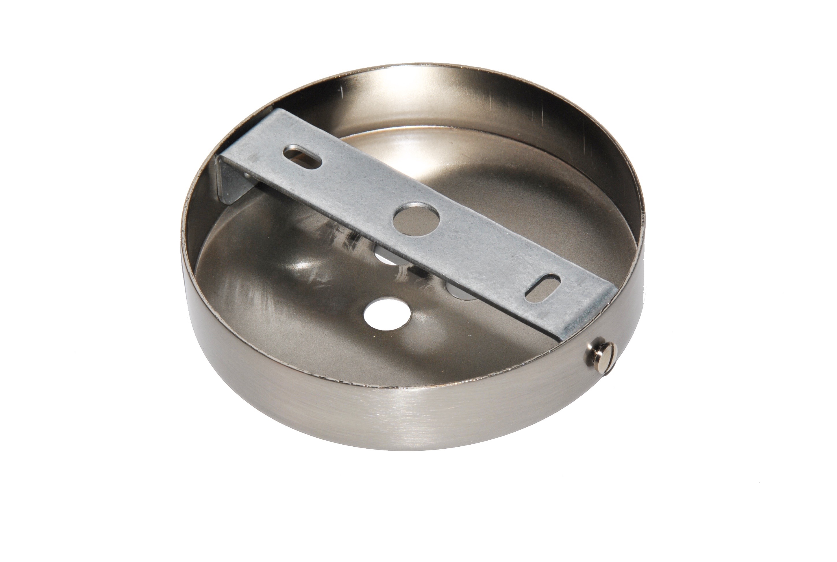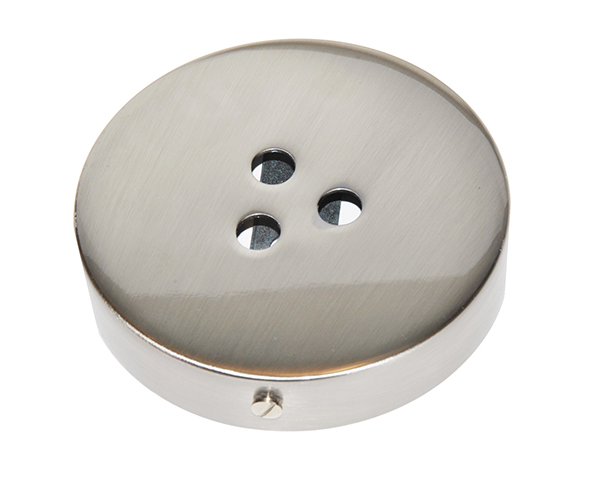 Metallbaldachin Oberfläche Stahl. Teil zur Deckenmontage zum Verdecken der Lampenverbindung. Mit drei Löchern für drei Kabelausgänge.