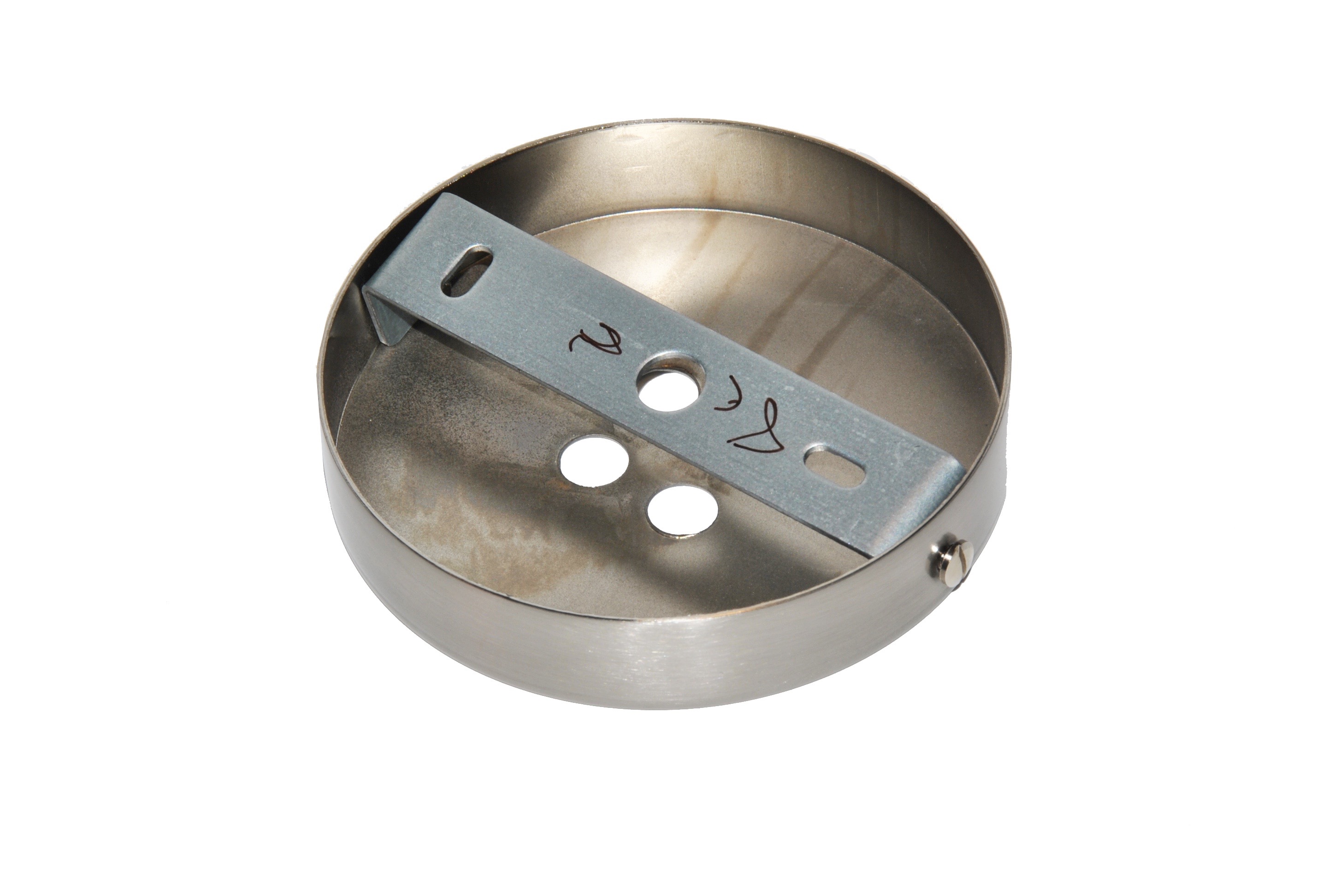 Metallbaldachin Oberfläche Stahl. Teil zur Deckenmontage zum Verdecken der Lampenverbindung. Mit vier Löchern für vier Kabelausgänge.