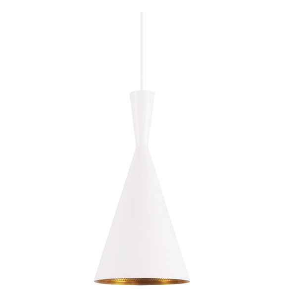 Lampe zum Aufhängen, inspiriert an dem Modell Beat Tall von Tom Dixon. Hergestellt aus Stahl von weißer Farbe, Oberfläche matt, die mit seinem goldfarbenem Innern kontrastiert. Kabel und Zierblende in weißer Farbe. Wir weisen besonders auf die goldene Farbe seines Innern hin, in welcher sich das Licht reflektiert und einen schönen kupferfarbenen Ton bekommt. Elegantes klassisches Design, das auch zu modernen Einrichtungen passt, sowohl in Wohnungen als auch in Büros und Geschäften. Sie kann allein oder in Kombination mit anderen Modellen aus der gleichen Kollektion eingesetzt werden.