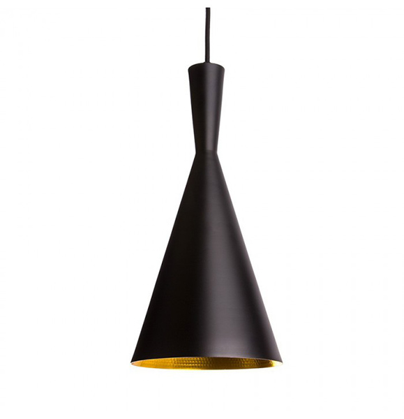 Lampe zum Aufhängen, inspiriert an dem Modell Beat Tall von Tom Dixon. Hergestellt aus Stahl von schwarzer Farbe, Oberfläche matt, die mit seinem goldfarbenem Innern kontrastiert.