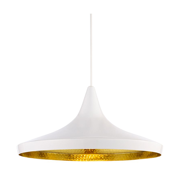Lampe zum Aufhängen, inspiriert an dem Modell Beat Wide von Tom Dixon. Hergestellt aus Stahl von weißer Farbe, Oberfläche matt, die mit seinem goldfarbenem Innern kontrastiert. Kabel und Zierblende in weißer Farbe. Wir weisen besonders auf die goldene Farbe seines Innern hin, in welcher sich das Licht reflektiert und einen schönen kupferfarbenen Ton bekommt. Elegantes klassisches Design, das auch zu modernen Einrichtungen passt, sowohl in Wohnungen als auch in Büros und Geschäften. Sie kann allein oder in Kombination mit anderen Modellen aus der gleichen Kollektion eingesetzt werden.