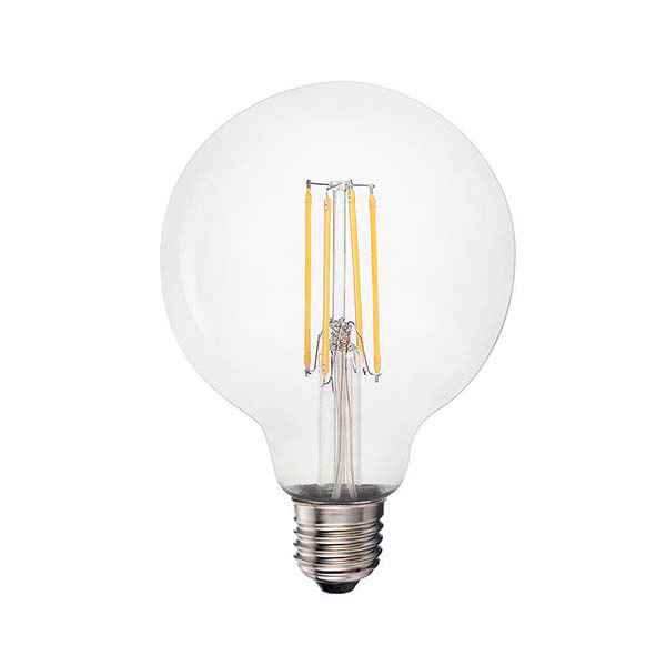 Globe aus transparentem Glas, Durchmesser von 95mm. Glühfäden aus Mikro-LEDs mit einer hohen Energieeffizienz (reduziert den Stromverbrauch bis zu 90%). Sie verbrauchen nur 6W, mit einer Äquivalenz von etwa 60W der herkömmlichen Glühbirne.