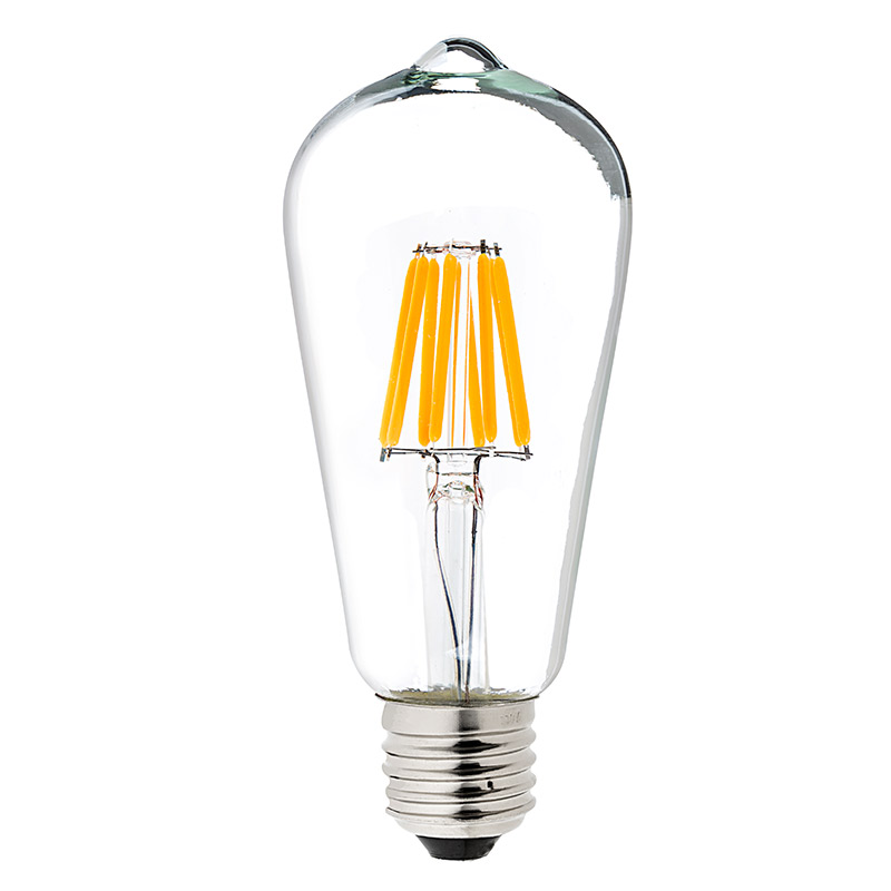 Dekorative Glühbirne, die antiken Glühlampen nachahmend. Dekorieren, schaffen Ambiente, beleuchten. Glas transparent, eiförmig, Kolbenform Replik der ersten Glühbirne Edison. Glühfäden aus Mikro-LEDs mit einer hohen Energieeffizienz (reduziert den Stromverbrauch bis zu 80%). Sie verbrauchen nur 4W, mit einer Äquivalenz von etwa 35W der herkömmlichen Glühbirne.