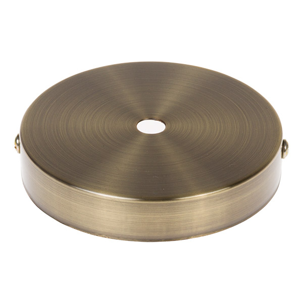 Metallbaldachin flach in Oberfläche Gold alt. Vintageausgabe. Teil zur Deckenmontage und zum Verdecken der Lampenverbindung. Abmessungen: Durchmesser=99mm. Höhe=24mm. Loch für Kabel:=10mm.