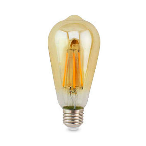 Dekorative Glühbirne, die antiken Glühlampen nachahmend. Dekorieren, schaffen warme und anheimelnde Ambiente, beleuchten. Glas bernsteinfarben (gold), eiförmig, Kolben Replik der ersten Glühbirne Edison. Glühfäden aus Mikro-LEDs mit einer hohen Energieeffizienz (reduziert den Stromverbrauch bis zu 80%). Sie verbrauchen nur 7W, mit einer Äquivalenz von etwa 60W der herkömmlichen Glühbirne. Mit warmem Licht (2700ºk).