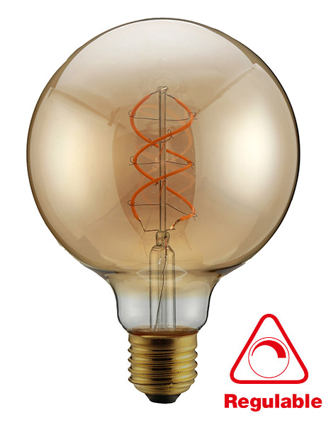 Dekorativer LED Globe von großen Abmessungen (Durchmesser=125mm) aus bernsteinfarbenem Glas. Seine LED in Form eines Glühfadens in Doppelspirale und sein sehr warmes Licht (2200ºk) machen es zu einem attraktivem Zierelement in Vintageoptik. Verbraucht nur 5W und leuchtet 300 Lumen. Ideal für Lampen oder Hängeleuchten, bei denen die Glühbirne sichtbar ist.
