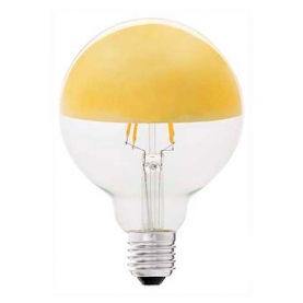 Schöne dekorative Glühbirne in Globeform von 95mm Durchmesser. Mit LED-Glühfäden von sehr warmem Licht (3000ºk) um die Wärme der Glühleuchten zu simulieren. Oberer Teil der Glühbirne in Aluminium mit Spiegeleffekt, silberfarben. Blendet nicht, da das Licht von dem unterem Teil und den Seiten aus scheint. Ideal um zu dekorieren, um stimmungsvolle Lichtinseln zu schaffen, Ladenschaufenster, etc.