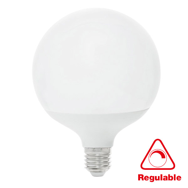 Glühbirne in Globeform mit Glas opal (matt) mit einem Durchmesser von 120mm. Verbrauch von 18W. Sie bietet etwa die gleiche Menge Licht wie ein Halogenglühbirne mit 150W. (1650 Lumen). Mit warmem Licht (2700ºk).