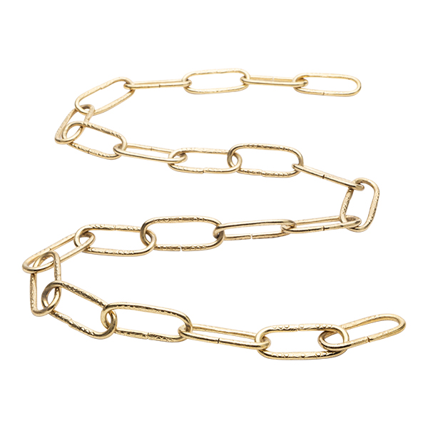 Lampenkette, hergestellt aus Messing mit goldfarben glänzender Oberfläche, Kettenglieder mit geprägten Verzierungen Dekorative Kette um Hängelampen zu befestigen. Ersatzteil um Ihre alte Lampe zu restaurieren oder zu reparieren, oder um eine neue herzustellen.