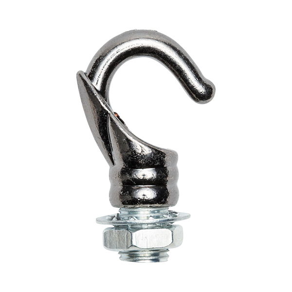 Haken mit abgerundeten Formen hergestellt aus Metall Oberfläche schwarz graphit. Dekoratives Zusatzteil zum Schrauben an die Lampenfassung oder Lampe und sie an die Decke hängen zu können.