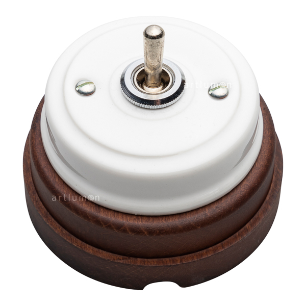 Aus-Wechselschalter mit Hebel, gemeinhin als „Kippschalter“ bezeichnet. Der Schalter ist elegant in das Porzellan integriert, vollendet mit einer Metallringblende. Montiert auf einer Basis aus Buchenholz gebeizt Farbe dunkelbraun. Lassen sich perfekt mit unseren Steckdosen aus Porzellan aus der gleichen Serie kombinieren.