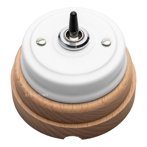Aus-Wechselschalter mit Hebel, gemeinhin als „Kippschalter“ bezeichnet. Der Schalter ist elegant in das Porzellan integriert, vollendet mit einer Metallringblende. Montiert auf einer Basis aus Buchenholz gebeizt Oberfläche natur. Lassen sich perfekt mit unseren Steckdosen aus Porzellan aus der gleichen Serie kombinieren.