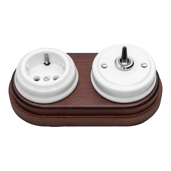 Set aus einem Schalter aus Porzellan mit Hebel, gemeinhin als „Kippschalter“ bezeichnet, und Steckdose aus Porzellan auf Doppelrahmen aus Holz. Der Hebel, von schwarzer Farbe, ist elegant in das Porzellan integriert, vollendet mit einer Metallringblende. In dieser Komposition sticht das Holz heraus, das das Set umgibt. Schalterzusammenstellung sehr üblich in den Schlafzimmern. Schalter und Steckdose sind angeordnet auf Holz natur, das dem Set eine große persönliche Note und Kraft verleiht. Das Werk aus handbearbeitetem Holz bringt das weiße Porzellan zur Geltung, und erschafft so eine Einheit aus Schalter und Steckdose, die nicht übersehen wird. Buchenholz, gebeizt in dunkler kastanienbrauner Farbe