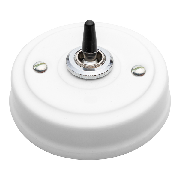 Aus-Wechselschalter mit Hebel, gemeinhin als „Kippschalter“ bezeichnet. Der Schalter ist elegant in das Porzellan integriert, vollendet mit einer Metallringblende. Lassen sich perfekt mit unseren Steckdosen aus Porzellan aus der gleichen Serie kombinieren.