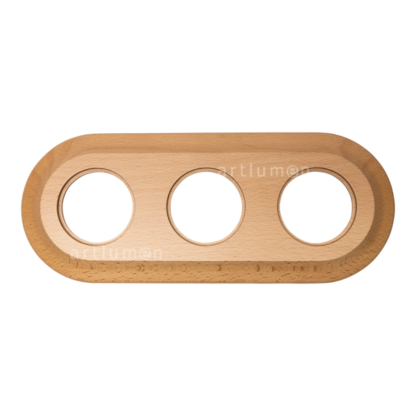 Holzrahmen für die Installation von drei Elementen aus dieser Unterputzserie in Dose (geeignet für runde oder quadratische Unterputzdosen). Schönes Buchenholz, mit weichen runden Flächen, handbearbeitet und lackiert, Oberfläche natur.