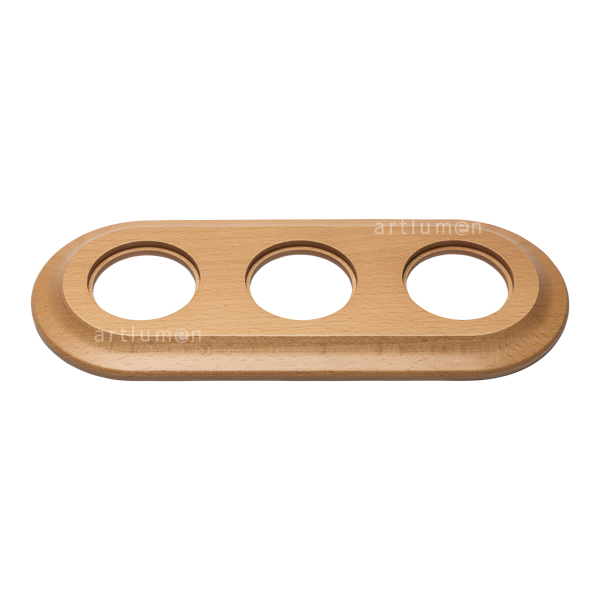 Holzrahmen für die Installation von drei Elementen aus dieser Unterputzserie in Dose (geeignet für runde oder quadratische Unterputzdosen). Schönes Buchenholz, mit weichen runden Flächen, handbearbeitet und lackiert, Oberfläche natur.