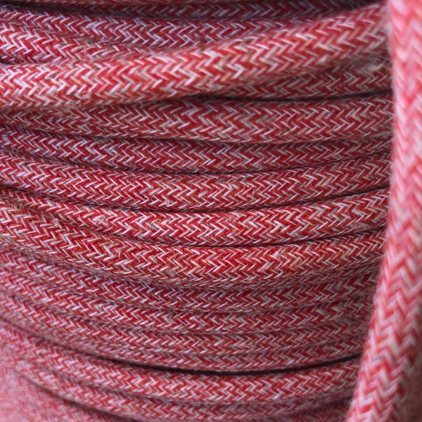 Rundes Stromkabel mit Textilummantelung aus Baumwollfasern Farbe crimson-rot und Leinen natur. Seine Kombination aus zwei miteinander verwebten Fäden in zwei Farben bilden eine matte Oberfläche, die Behaglichkeit beisteuert zu diesem dekorativen Kabel.