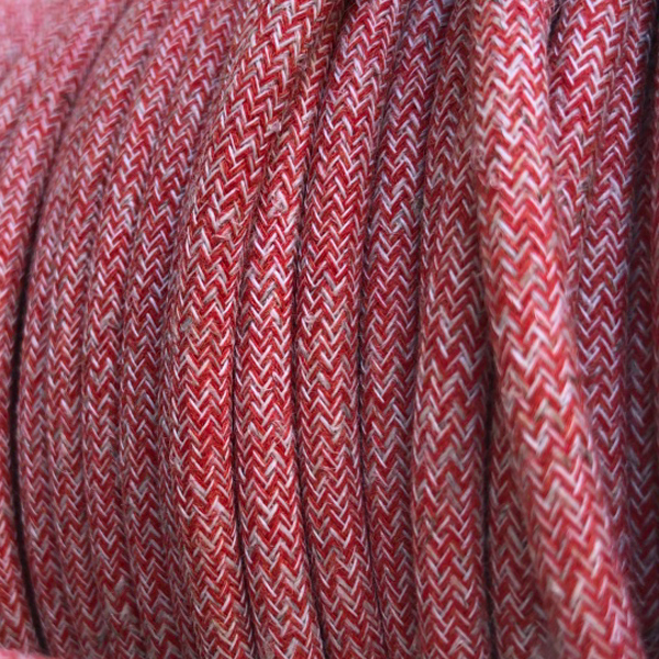 Rundes Stromkabel mit Textilummantelung aus Baumwollfasern Farbe crimson-rot und Leinen natur. Seine Kombination aus zwei miteinander verwebten Fäden in zwei Farben bilden eine matte Oberfläche, die Behaglichkeit beisteuert zu diesem dekorativen Kabel.