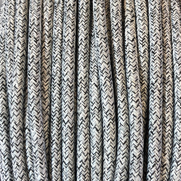 Stromkabel ummantelt von einem Gewebe aus gemischten Fäden in den Farben weiß, schwarz und grau. Dieses Geflecht erzeugt eine neue undefinierte Farbe aus einer Palette von mittelgrau.