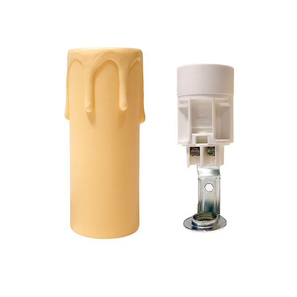 Lampenfassung Kerzenimitation für die Restauration von Lampen. Kunststoffhülse, die eine Kerze mit Wachstropfeneffekt simuliert in Farbe elfenbein. Enthält ein Schraubgewinde für Glühbirnen mit feinem Gewinde (E-14) mit Metallhalterung mit Gewindesteigung 10/100 (der Standard bei Lampen). Sehr nützliches Teil, um alte Schraubgewinde in alten Kandelabern zu ersetzen. Falls sie nicht in den Leuchter eingeschraubt werden können verfügen wir über ein Zusatzteil; Flaschenverschluss, der unter Druck befestigt wird um den Kerzenhalter einschrauben zu können.