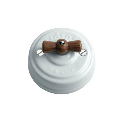 Kreuzschalter aus Porzellan mit Drehmechanismus. Originaldesign, Replik der antiken Lichtschalter der ersten elektrischen Installationen Ideal für rustikale Umgebungen oder um Ihrer Einrichtung einen Vintagetouch zu verleihen. Kreuzschalter (erlaubt das kombinierte Einschalten von drei Punkten aus). Hergestellt aus Porzellan. Mit Schleife (Griff) aus Holz Oberfläche Bubinga