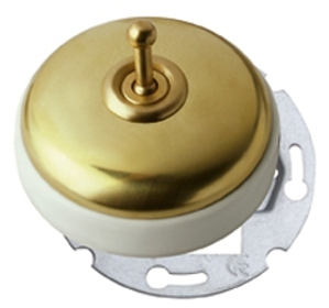 Kreuzschalter hergestellt aus Messing glänzend, montiert auf einem Porzellankorpus, inspiriert von der Philosophie des Jugendstils.