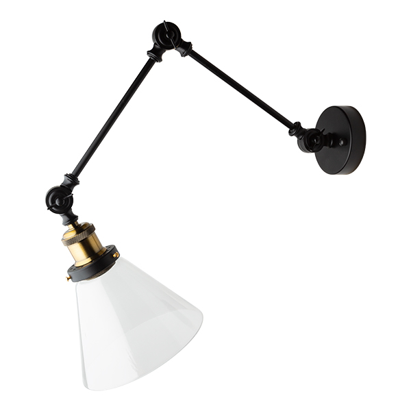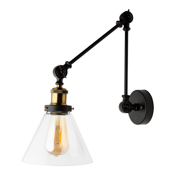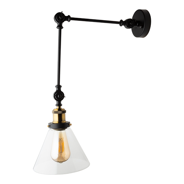 Gelenk-Wandleuchte hergestellt aus Metall im Industriestil. Ihr schwarzer Metallarm hat drei Gelenke, die ihm gestatten, verschiedene Positionen einzunehmen und dabei in der Höhe und im Abstand zur Wand eingestellt zu werden. Schraubgewinde aus Metall in Oberfläche gold alt mit Zierblende Schirmhalterung. Kegelförmiger Schirm aus transparentem Glas. Er kann auch an die Decke montiert werden. Ideal für das Zuhause, Geschäfte, Cafés, etc.