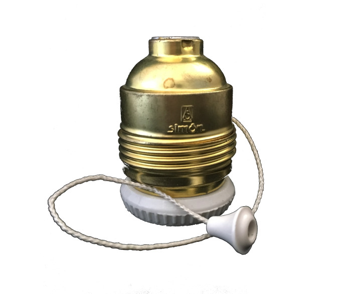 Lampenfassung Metall goldfarben mit Ring aus beschichteter Keramik. Sie hat seitlich einen Schalter integriert, der mit einer Zugschnur betätigt wird. Erlaubt eine Lampe zu montieren, die an der gleichen Lampenfassung eingeschaltet wird (ganz ohne weiteres Kabel).