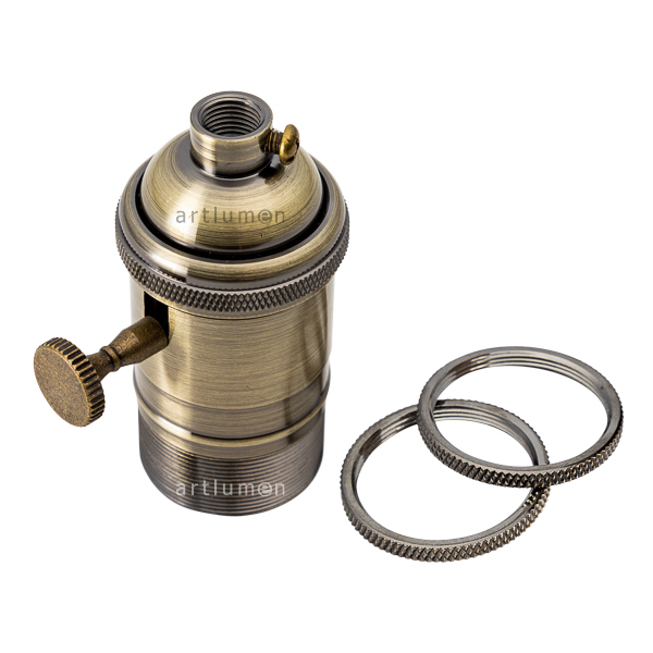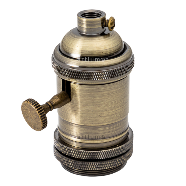Lampenfassung Metall, Oberfläche goldfarben alt. Sie hat einen Drehschalter an ihrer Seite integriert. Jede Viertelumdrehung des Schalters schaltet die Glühbirne an oder aus. Sehr geeignet zum Montieren oder Restaurieren von Lampen in Vintageoptik. Für Glühbirnen mit Standardgewinde E-27. Oberer Teil mit Gewindesteigung 10/100. Anschluss des Kabels mit Schraube.