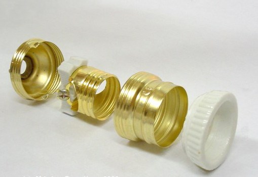 Lampenfassung Metall und Keramik E14. Exakte Replik der Original Lampenfassung „von jeher“. Korpus aus goldfarbenem Metall mit Keramikring. Ideal, um Ihren Leuchten einen Retrotouch zu geben oder um Ihre Antiken zu restaurieren. Für Glühbirnen mit feinem Gewinde (E-14). Auch erhältlich mit Standardgewinde (E-27). Oberer Teil mit Gewindesteigung 10/100. Klemmanschluss des Kabels mit Schraube.