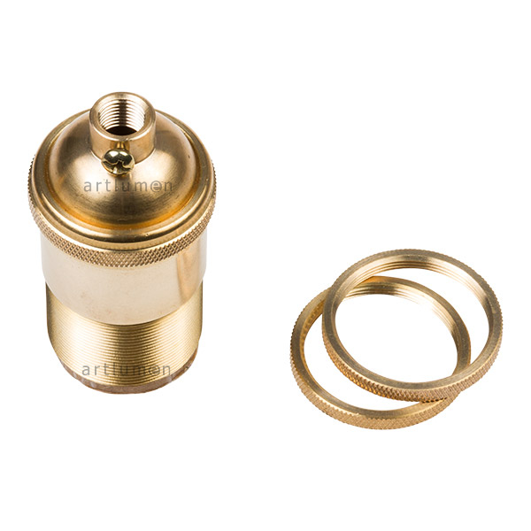Lampenfassung aus Metall Oberfläche Messing. Halber Korpus glatt und am Ende mit Gewinde mit Metallringen für Lampenbefestigung. Für Glühbirnen mit Standardgewinde (E-27). Oberer Teil mit Gewindesteigung 10/100 und Klemmschraube. Klemmanschluss des Kabels mit Schraube.