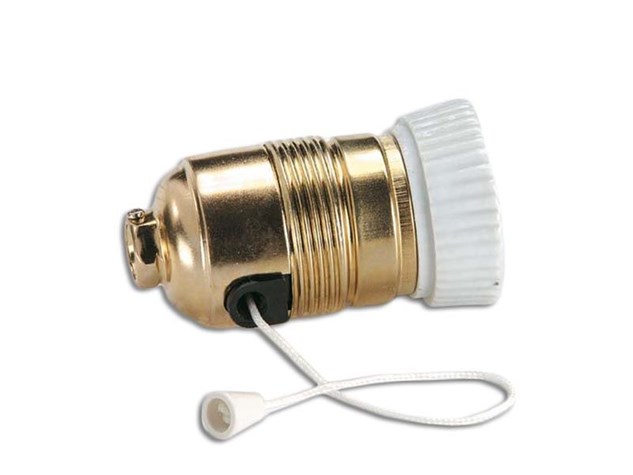 Wir präsentieren Ihnen diese Lampenfassung aus goldfarbenem Metall mit Keramikring. Die Lampenfassung hat seitlich einen Schalter, der mit einer Zugschnur betätigt wird. Sie erlaubt Ihnen, eine Lampe zu montieren, die an der gleichen Lampenfassung eingeschaltet wird (ganz ohne ein weiteres Kabel zu benötigen). Diese Lampenfassung aus Metall ist nur für Glühbirnen mit Standardgewinde (E-27) geeignet. Oberer Teil mit Gewindesteigung 10/100. Klemmanschluss des Kabels mit Schraube. Wichtiger Hinweis: diese Lampenfassung trägt keine Lampenschirme.