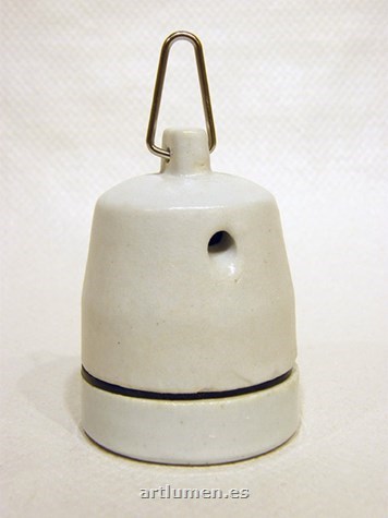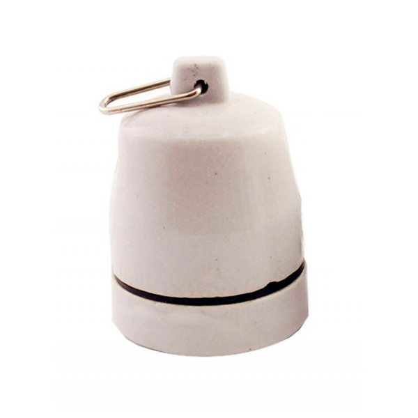 Lampenfassung aus weißem Porzellan mit Abschluss in einer Metallaufhängung. Korpus glatt aus Porzellan beschichtet. Im Vintagestil, ist sie eine schöne Replik der klassischen Lampenfassung, die unter Verwendung eines geflochtenen Kabels aufgehängt wurde.