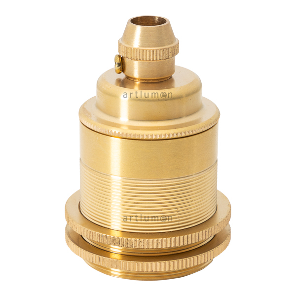 Lampenfassung von großer Qualität, massives Metall, in Industrie-Retrooptik, mit Oberfläche gold glänzend. Sie hat zwei Metallscheiben für die Befestigung von Lampenschirmen oder Schirmen. Dekorative Lampenfassung Vintage Stil “England”. Abschluss mit Kabelverschraubung in der gleichen Oberfläche wie die Lampenfassung.