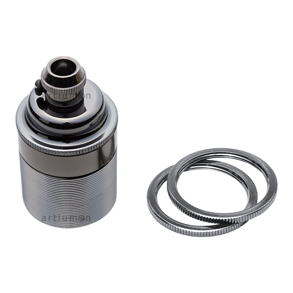 Elegante Lampenfassungen aus massivem Metall, Oberfläche graphit. In Industrie-Retrooptik, Typ “England”. Erlaubt mit seinen zwei justierbaren Scheiben die Befestigung der Lampenschirme. Verfügt über eine Kabelverschraubung im oberen Teil. Für Glühbirnen mit Gewinde E-27