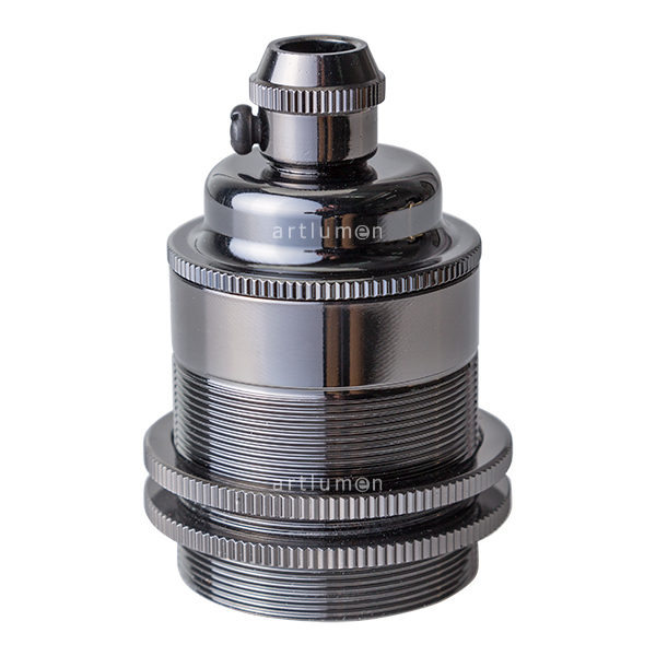 Elegante Lampenfassungen aus massivem Metall, Oberfläche graphit. In Industrie-Retrooptik, Typ “England”. Erlaubt mit seinen zwei justierbaren Scheiben die Befestigung der Lampenschirme. Verfügt über eine Kabelverschraubung im oberen Teil. Für Glühbirnen mit Gewinde E-27