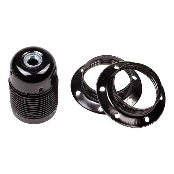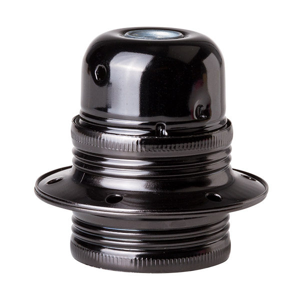 Lampenfassung Metall mit Korpusgewinde und zwei Ringen für Befestigung von Lampenschirmen oder Schirmen. Graphit. Für Glühbirnen mit Standardgewinde E-27. Oberer Teil mit Gewindesteigung 10/100. Klemmanschluss des Kabels mit Schraube.
