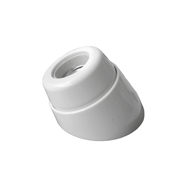 Lampenfassung mit gebogenem Sockel, aus Kunststoff in Farbe weiß. Schraubgewinde innen aus Keramik.