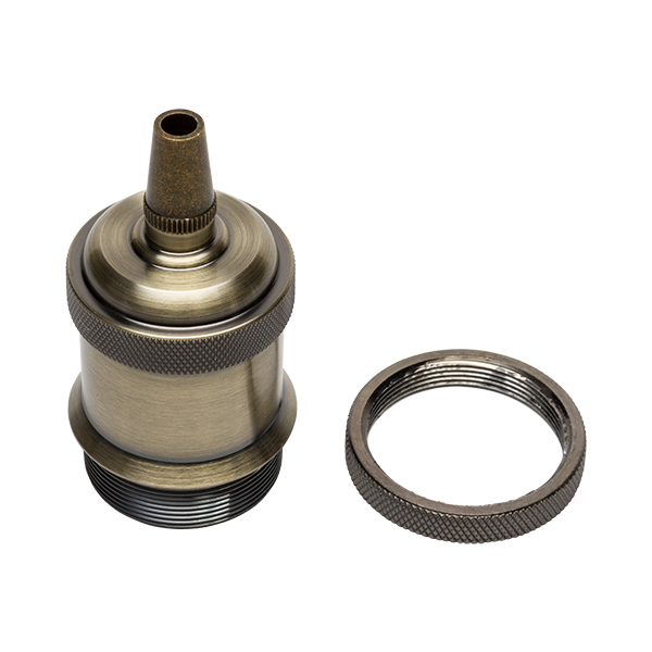 Robuste Lampenfassung aus Metall mit Oberfläche Farbe gold brüniert. Dekorativ, ideal für Hängeleuchten mit sichtbaren Glühbirnen. Für Glühbirnen mit Standardgewinde E-27. Oberer Teil mit Gewindesteigung 10/100. Enthält Kabelverschraubungen. Schraubring für Lampenbefestigung