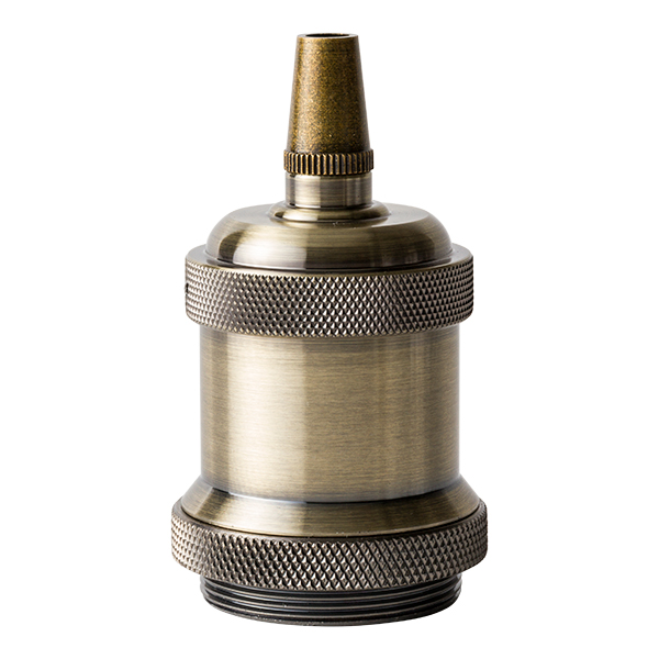 Robuste Lampenfassung aus Metall mit Oberfläche Farbe gold brüniert. Dekorativ, ideal für Hängeleuchten mit sichtbaren Glühbirnen. Für Glühbirnen mit Standardgewinde E-27. Oberer Teil mit Gewindesteigung 10/100. Enthält Kabelverschraubungen. Schraubring für Lampenbefestigung