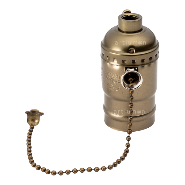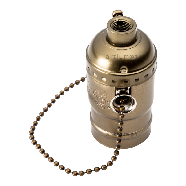 Lampenfassung aus Aluminium, Farbe gold brüniert im Industriestil Vintage. Sie hat seitlich einen Schalter integriert, der mit der Metallzugkette betätigt wird. Erlaubt eine Lampe zu montieren, die an der gleichen Lampenfassung eingeschaltet wird (ganz ohne weiteres Kabel). Endet in einem Gewinde 10/100 (Standard für Lampen).