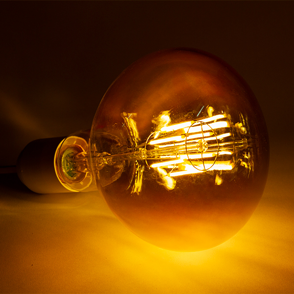 LED Glühbirne für dekorative Zwecke. Globe mit flachem oberen Teil, das uns an einen Pilz von großen Abmessungen erinnert. LED Glühfäden, mit warmem Licht (2700ºk) und Glas bernstein (goldfarben). Ideal für Geschäfte, Gastronomie und Hausgebrauch. Mit einem Verbrauch von nur 6W, äquivalent zu einer herkömmlichen Glühbirne von etwa 60W.