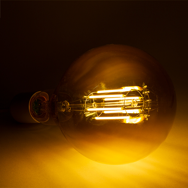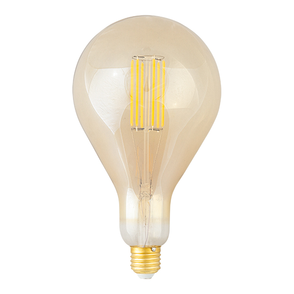 Dekorative LED Glühbirne von großen Abmessungen Standard riesig mit Tropfenform. Ideal für Geschäfte, Schaufenster und Dekorationen zu Hause. Lassen Sie sie mit einem unserer Lampenfassungen oder Kabel Vintage zur Geltung kommen. Glas bernsteinfarben, um ihr warmes Licht (2700ºk) zu potenzieren. Lange Glühfäden aus Mikro-LEDs Verbraucht nur 6W, äquivalent zu etwa 60W