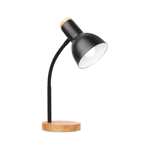 Tischleuchte in schwarzer Farbe mit Basis und Details in hellem Holz. Der obere Teil des Arms ist sehr flexibel und erlaubt das Licht nach Bedarf auszurichten. Ideal als Leselampe. Metallschirm mit Innerem in weißer Farbe. Mit Verbindungskabel von 2m, Farbe schwarz, Stecker und Schalter.